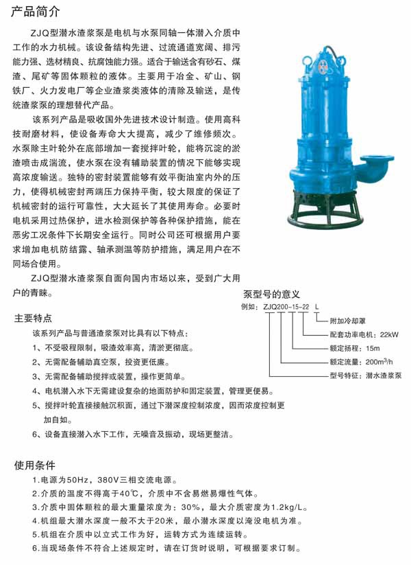ZJQ型渣漿泵是電機與水泵同軸一體潛入介質中工作的水利機械。該設備結構先進、過流通道寬闊、排污能力強;選材精良、抗腐蝕能力強。適合于輸送含有砂石、煤渣、尾礦等固體顆粒的液體。主要用于冶金、礦山、火力發電廠等企業渣漿類液體的清除及輸送,是傳統渣漿泵的理想替代產品。 ZJQ型渣漿泵性能參數范圍: 流量:30~1450m3/h 揚程:15~95m
